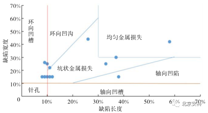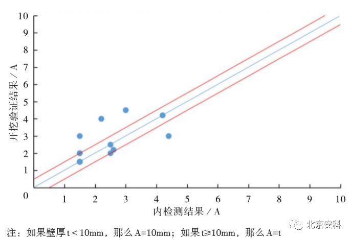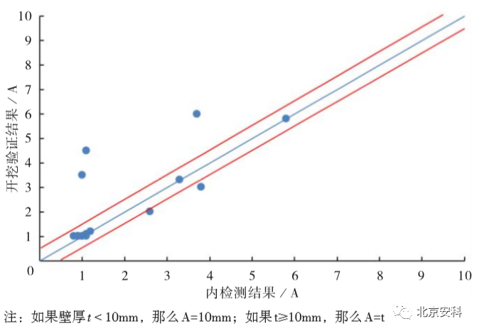 将内检测工具及现场验证的金属损失缺陷长度的结果进行直接对比并作出一致性对比,如图 6,由图 6可见,所有经验证的金属损失缺陷点大致均匀分布在一致线两侧,且有 5 处越出了 ±0.5A 边界线的范围。这表明内检测工具对金属损失缺陷长度的测量存在较大偏差,甚至超出了工具在 90% 置信度时的测量精度范围。