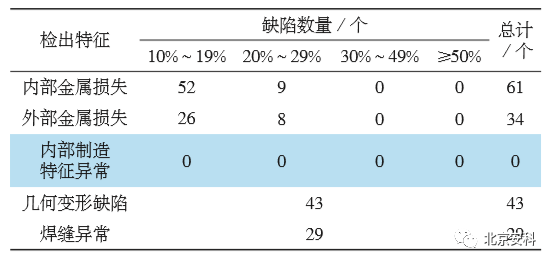 根据该管道漏磁检测结果,一共在检测段内检出了 61 处内部金属损失,34 处外部金属损失,29 处焊缝异常,43 处几何变形缺陷。检出特征的统计结果见表 1。