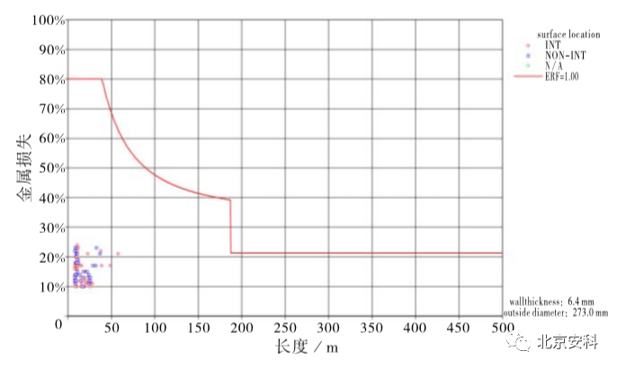 根据前述定义的评估参数,计算所有内部金属损失的金属损失速率和失效压力安全因子,结果分布见图 3。通过对这个参数的所有计算结果进行综合考虑并结合管道运营方的管理需求,选取 1.00 作为 1/ERF的阈值,即图 3 中红色实线所代表的值。