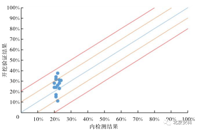 对所有经验证的金属损失缺陷的深度百分比、长度及宽度的绝对误差进行统计学计算,得到:① 深度百分比误差(内检测-开挖验证)=-4.23%±15.5% (NWT:公称壁厚),与 90% 置信度时的检测精度存在偏差;② 缺陷长度误差(内检测-开挖验证)=-7.1 ±23mm,与 90% 置信度时的检测精度存在偏差;③ 缺陷宽度误差(内检测-开挖验证) =2.18±15mm,与 90% 置信度时的检测精度存在偏差。